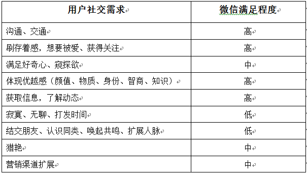如果遍历用户社交需求,并结合之前对微信功能的解构,可以分别列示各需求在微信中的满足程度: |
