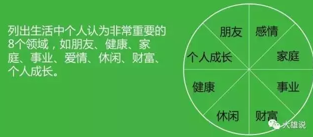 在对以上信息进行了仔细思考之后,我们就可以设定我们的年度目标了。每个人的年度目标肯定不是单一一种的,往往涉及到多个分类,这里可以参考生平衡轮,对我们这一年最看重的各个细分目标进行一个分类。常见的分类包括健康,家庭,事业,爱情,朋友,财富,个人成长和休闲等。然后分类列出这些分类里的目标。