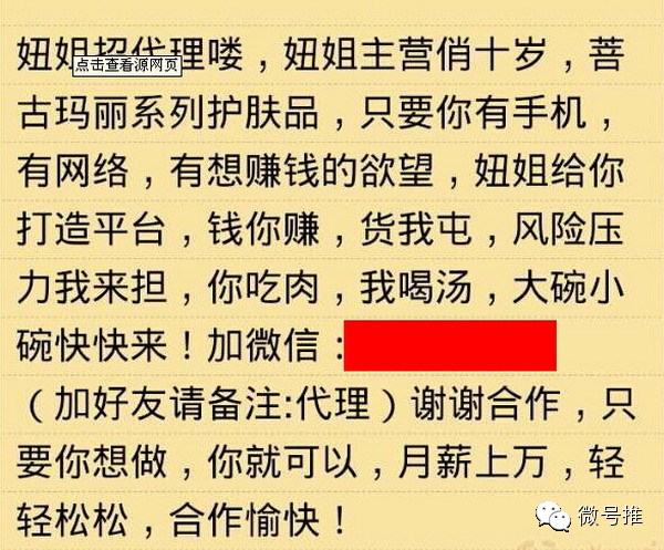如果“微商“做到了只发展代理的地步,跟传销有什么区别?比如一个朋友帮助某面膜厂家招代理,厂家给她提成,结果她招了很多代理,每个月可以拿掉500万左右的货,但是代理们的面膜卖出去的很少,与其说这些面膜是卖给消费者的,不如说是卖给一个个做着发财梦的代理的。