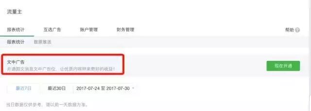 公众号根据内测邀请提示称:在微信公众号后台“流量主”——“报表统计中”发现,已有“文中广告”的开通按钮。