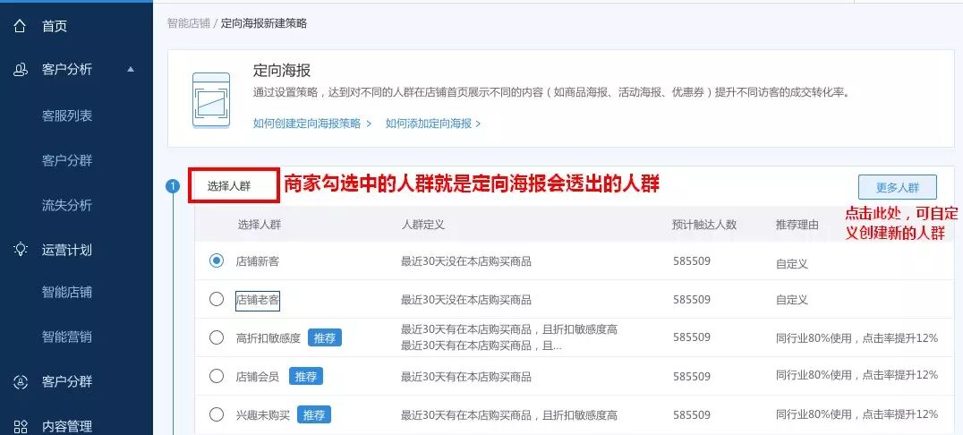 根据之前设置人群策略,触达不同海报,对不同的人群在店铺首页展示个性的内容(如优惠券、商品图等),并提升访客转化率的目的。定向海报可以能够千人千面,支持定向分发不同人群策略,向不同的人说不同的话。