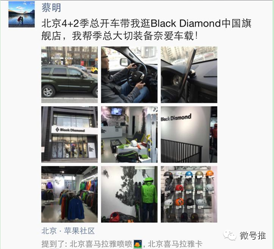 这时候我发现,在朋友圈分享我户外店的装备,我分享我喝的好茶叶,分享我吃的好水果,分享我去过的饭店,分享我住过的酒店,我发现起了一个很好的引导作用,而且转发率特别高。我觉得如果现在3000个粉丝,我要说一个东西好,就有一两百号人跟帖,很多人会找我买东西。我微博好几万,互动少,弱关系;微信3000多粉丝,互动多,都是强关系,转化率特别高。