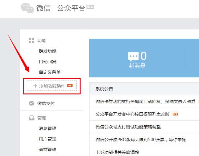 1、入口位置位于微信公众平台左侧的添加功能插件“+”(加号)栏。