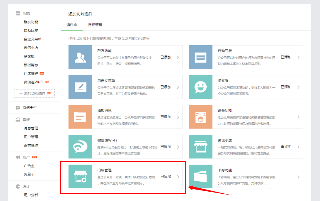 2、进入后选择“门店管理”插件,点击“申请开通”。若您的公众号符合相关资质(初期向有认证资质的服务号及有卡券功能的公众号开放),该功能将即时开通。