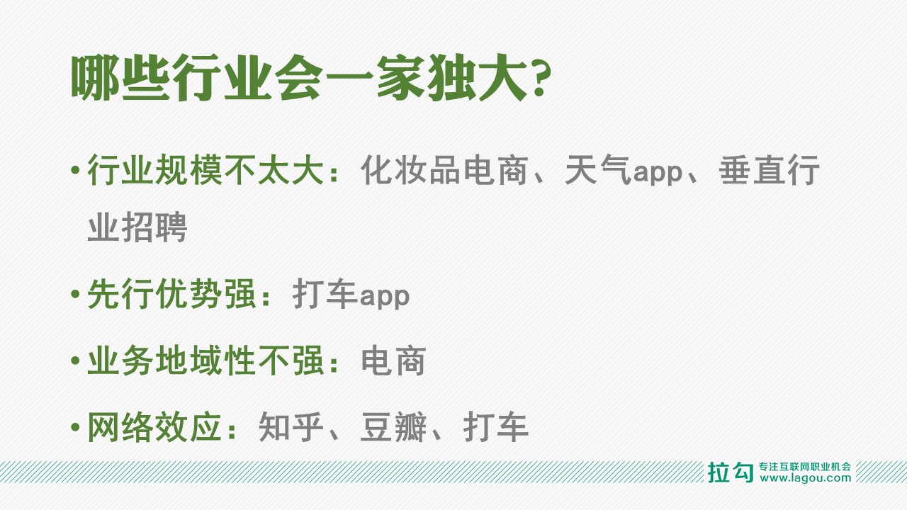 相反,行业规模不大,先行优势明显、行业地域性不强、而且网络效应突出的行业,先行者们会迅速一家独大,然后形成大树底下不长草的格局。