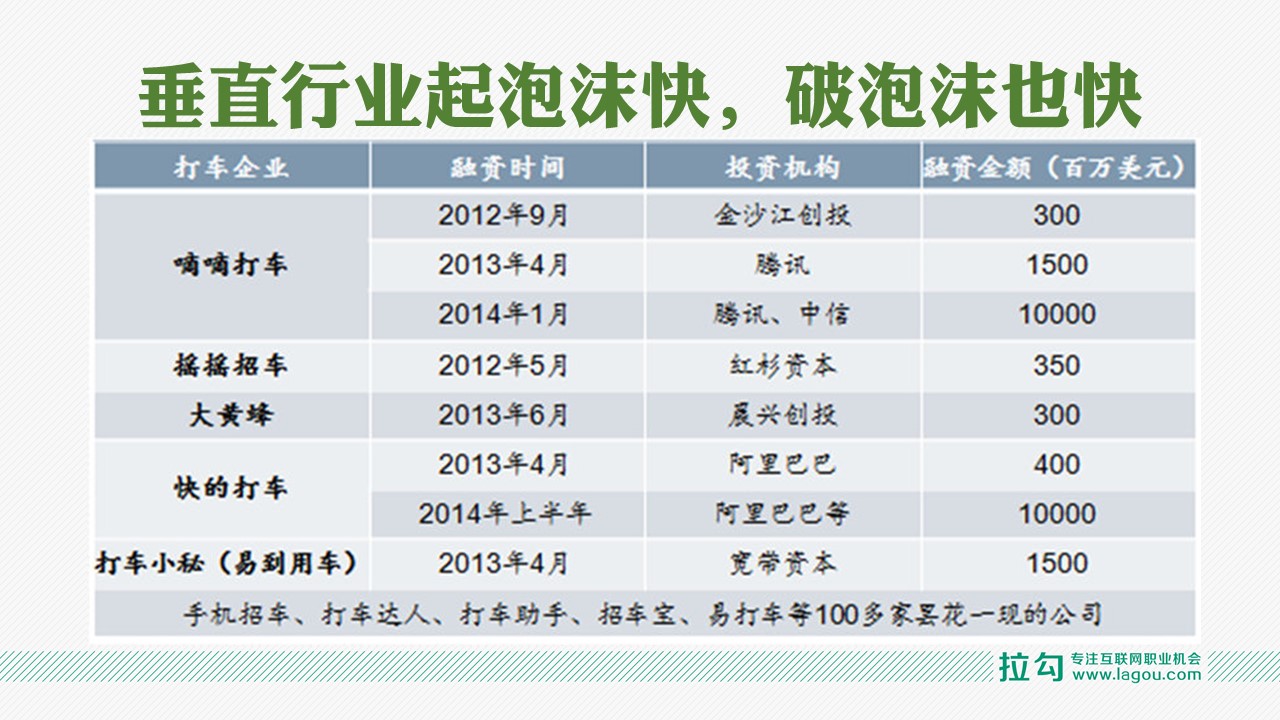 比如,互联网招聘在2014年热到了极致。稍有故事的公司,都拉到了投资。但才短短一年多,某一度仅次于拉勾网的招聘网站寻求贱卖,大街网裁员,海丁网合伙人离职,拉勾网之外的公司大多在垂死挣扎。投资人撒在这个领域的钱,基本都打水漂了。