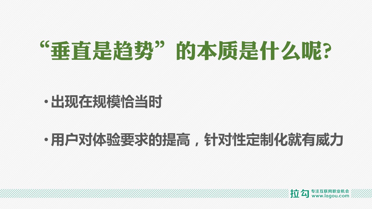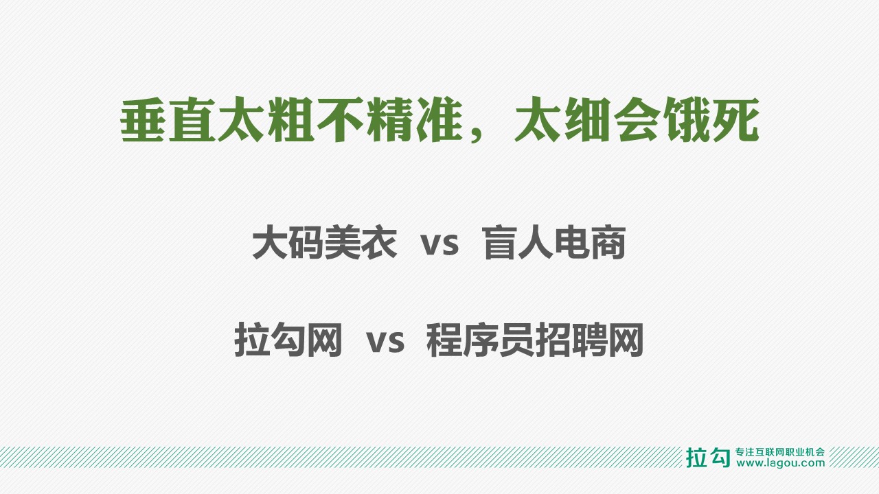 比如我一个朋友做了个大码美衣,给胖女孩选衣服的app,因为胖女孩在中国的人口总数足够多,这个垂直就挺值得做的。但有创业者做盲人电商,我觉得就廷没有前途,因为市场规模是在太小。同样的例子就是招聘行业,前程无忧做全行业,拉勾网只做互联网行业,就可以针对互联网行业求职者提供很好的体验,可以完败前程无忧。但是,有些创业公司在互联网行业之下再做细分的设计师、程序员垂直招聘网站,就不可以了,因为太细了,人数太少,最终公司就无法做起来,会被饿死。