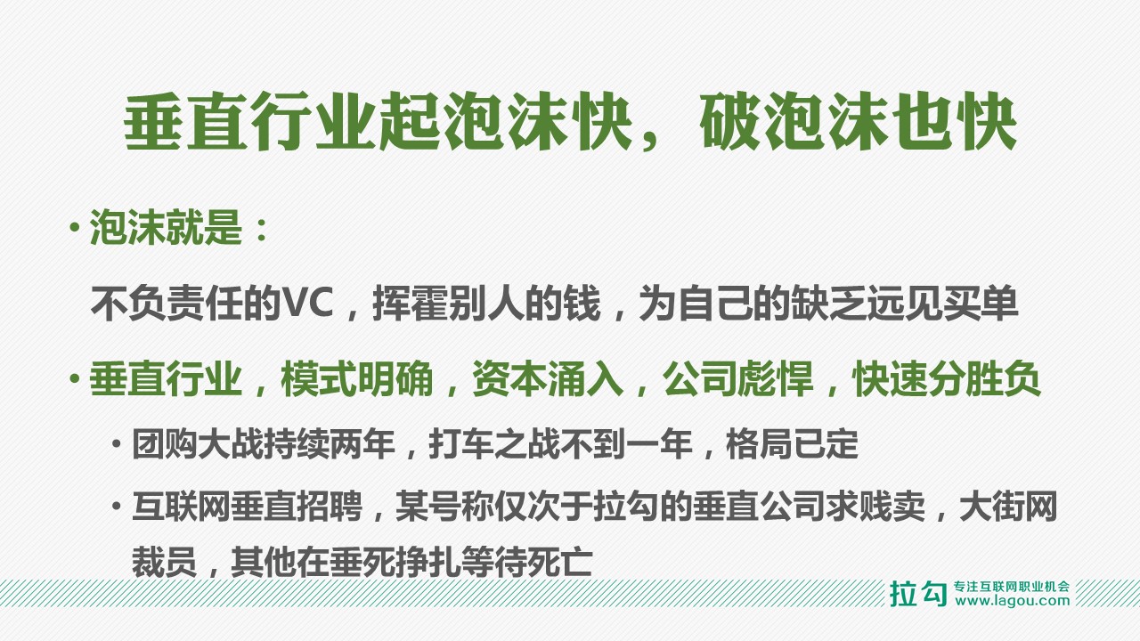 导读:11月28日,拉勾网创始人、董事长许单单财经天下举办的“异想大会”上,深度阐述近年来泡沫横生的垂直行业。许单单结合一系列垂直领域互联网公司中的赢者和死者,分享了他自己的生存法则。