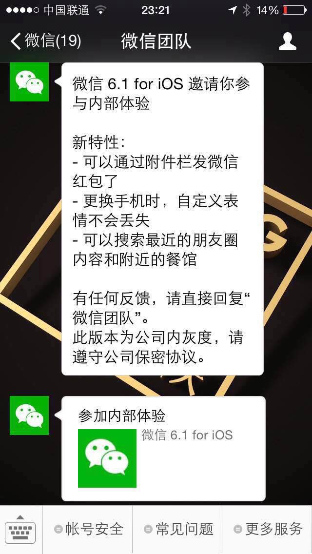 昨天在某微信群看到一张截图,是有关微信6.1内测参与邀请的,老贼不是腾讯员工,所以体验肯定是没机会了,但这次的新功能介绍还是让我眼前一亮,先来看截图。
