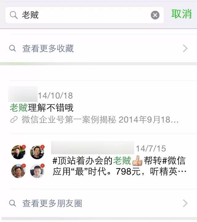 可以看到朋友圈搜索是放在通讯录搜索那个里面的,而且这个最近朋友圈内容的时间区间起码是在6个月以上的,因为上图的搜索结果中第二条是14年7月的消息,搜索范围包括链接分享和图片分享,只要朋友圈消息文字中包含着关键字就会被搜索到。当然这里有个核心原则是你只能搜索你好友的朋友圈。