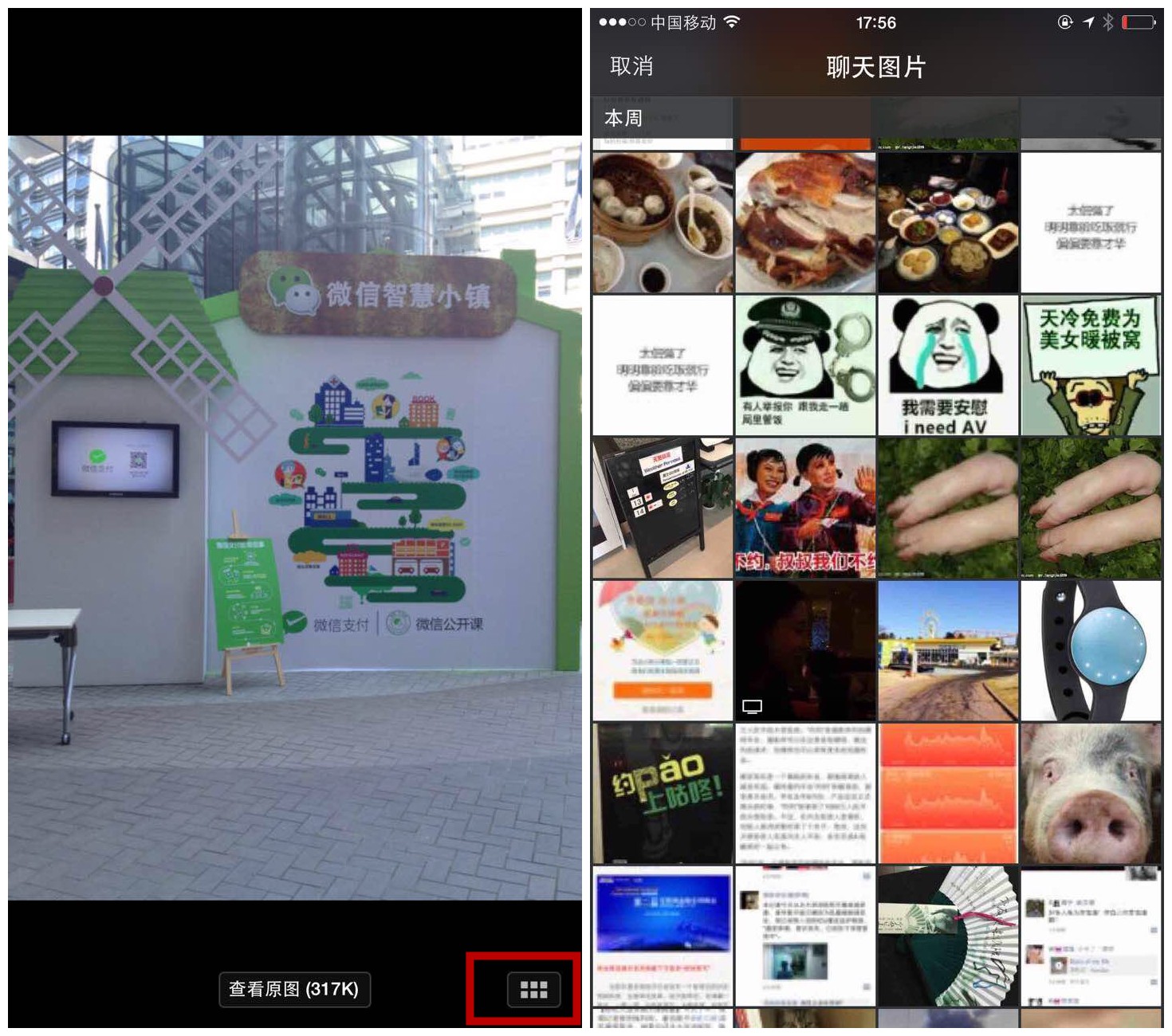 找群聊图片翻断手指爽吗?微信推出“图片墙”后,你只要在对话模式中随意打开一张图片,并点击右下角的小方框,就能将历史图片全都呈现出来。解放手指谁最强,微信图片墙来帮忙!不知道这功能的都别说自己会玩微信!
