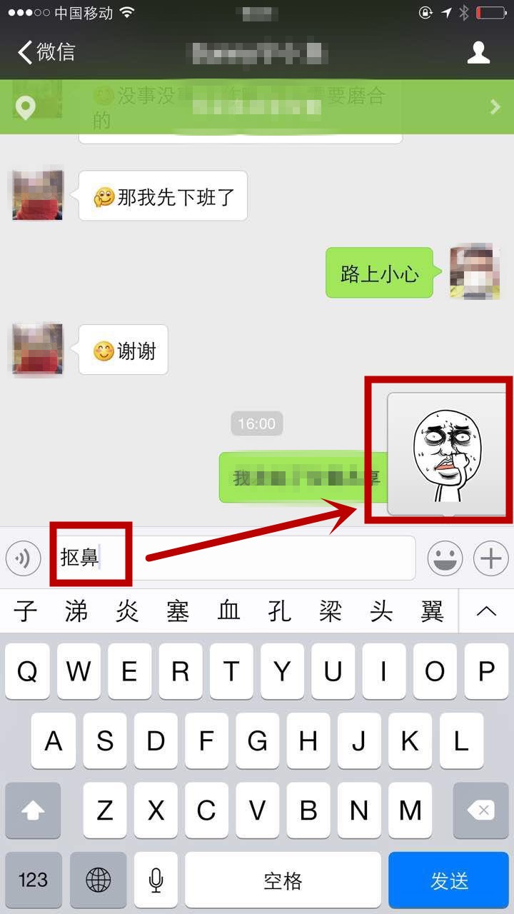 聊天表情最能体现逼格。输入“抠鼻”,微信在你下载的表情中,自动帮你推荐抠鼻表情,有没有很贴心?免去了找表情的步骤,简直是装逼路上的小棉袄。