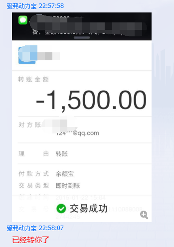 查了下支付宝,果然有一笔1500的费用到账。