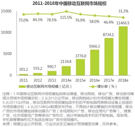 2014年中国移动互联网市场规模达到2134.8亿元人民币,同比增长115.5%,同时未来依旧会保持高速增长,预计到2018年整体移动互联网市场规模将突破1万亿大关。