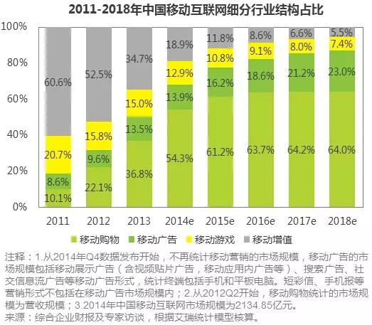 2014年中国移动互联网各细分行业结构分布中,移动购物一枝独秀占到54.3%的份额,较上年提高17.5个百分点,预计到2018年将占到整体份额的64%。移动广告市场从2014年开始逐步向成熟化发展,占据13.9%的市场份额,预计到2018年其占比可达到23%,稳步提升。移动增值作为曾经移动互联网的支柱领域,随着电信运营商管道化趋势发展,依靠其生存的SP/CP模式受到冲击,移动增值份额大幅缩减,预计到2018年其占比会进一步降低到5.5%。