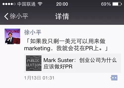 小编寄语:此篇文章是著名天使投资人徐小平老师在前段时间分享到朋友圈的,他还特意把文章里那句“如果我只剩一美元可以用来做marketing,我就会花在PR上。”提取了出来。如果你在创业,那么你应该仔细读完...