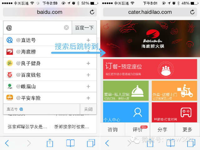 和“轻应用”相比,百度“直达号”更专注于 O2O 和服务。“直达号”其实和此前几年百度世界推出的百度云、轻应用服务是一脉相承的,不同的则是更完善的生态支撑。用户可以在移动百度搜索框中输入,例如 @海底捞,进入商户的服务;或者直接搜索商户名称,直达号链接将会在搜索结果中置顶。
