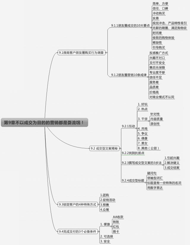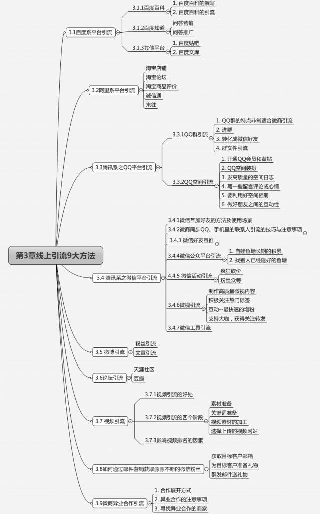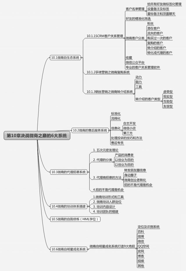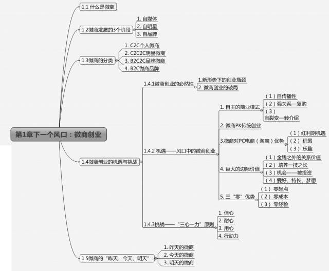 今天,有很多人像你一样,都梦想成为一名赚钱的微商,有的即将上路,有的已经在路上。做微商难,做一个赚钱的微商则是难上加难,为了帮助那些有梦的微商们,这里从自我定位、模式定位、产品定位、线上引流、线下引流、朋友圈引流、微信群引流、微商必会工具、客户关系建立和维护、成交型营销、各类微商系统(售后服务、代理招募、培训体系、自我修炼、自明星系统)等各方面分享了微商运营。这些内容共分为10堂课,为了便于阅读,我们用思维导图来呈现它们,希望能够给真正有梦的微商们带来最切实可行的指导。