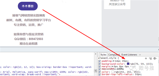 然后选中要修改的样式,点击“审核元素”或直接点击下面的放大镜寻找要修改的样式,选中之后在右边就可以直接去点击修改样式了,和上面一样,如下我把圆角、背景颜色、大小都改了一下: