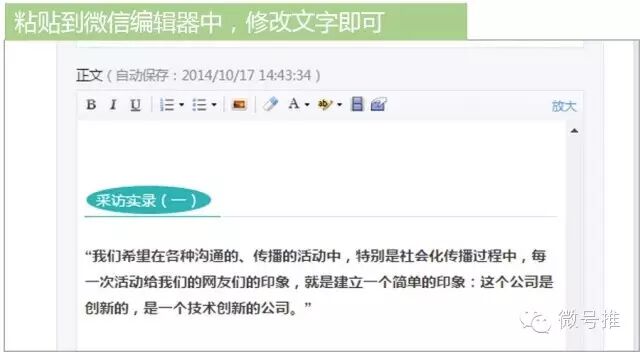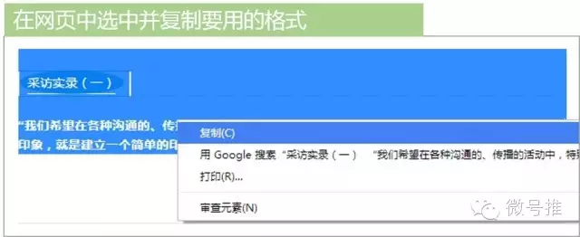 这应该算是最原始的方法了,首先你要在平时多收藏一些带有精美图文格式的文章,用到的时候在网页上打开,选中你要的格式,复制到微信编辑器里,将文字替换即可,如下图所示: