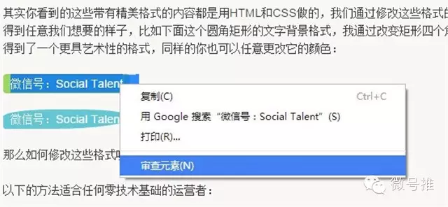 Step 1: 首先你要装一个Chrome浏览器(Opera和Firefox也可以,但是Chrome是最佳选择)。在浏览器中打开带有你想要的格式的网页,选中你要用的格式对应的内容块,如下图所示,我们选中这个带有圆角矩形背景的内容块。