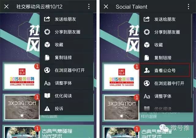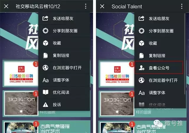 目前用户关注公众号的途径主要有两个:图文标题下方的公众号名称(“蓝色小字”),以及在右上角菜单中“查看公众号”。第一种方法不多说了,很多公众号都有各种各样引导关注的尝试。