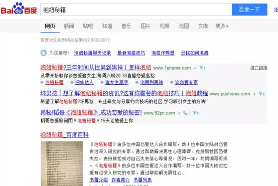 前三位都是做了百度竞价,可想而知这个利润有多高。有些是贩卖教程,有些是传授泡妞技术。不管怎么样,要想教授别人怎么去追女孩子,就要去追无数个女孩子积累经验。2014年流行自媒体,如果有哪个人专注打造一个恋爱专家,我想粉丝肯定无数。1000个超级粉你会活得很滋润。