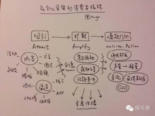 7、社会化营销的消费者旅程,我简单称之为3个A(Attract 吸引, Amplify 扩散, Action 唤起行动)。事实上,跟很多人的理解不一样,社会化营销不是开帐号发内容等关注等转发,它的学问一点都不简单。