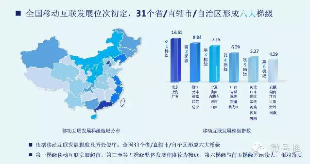 因此,互联网+指数排名越靠前,证明该地区移动互联发展相对其他地区更为成熟,网民成熟度也越高,越具有当前的投资价值。以31个省/直辖市/自治区/排名来看,报告将其分为六大阶梯,第一阶梯中包括北京、上海、广东;第六阶梯包括安徽、湖南、江西、甘肃、贵州和西藏。而从城市排名看,最大的黑马——防城港这个地级市超过很多省会级城市排名第二,说明它最具当前的投资价值。