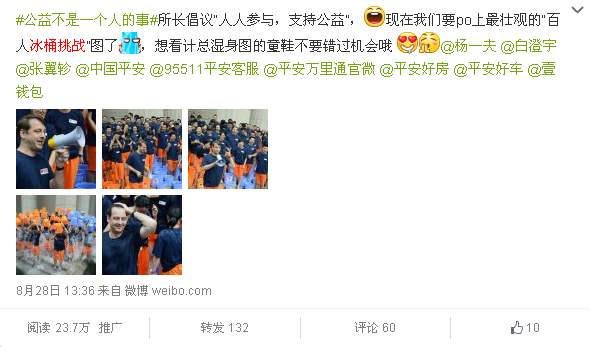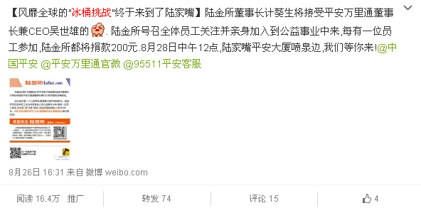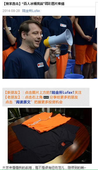 8月18日上午雷军成为大陆地区首位参与的名人,下午即与客户会议沟通做出策划建议及细化内容,并成功促成计葵生参加挑战,经过多轮的沟通及细化确认,最终在8月28日成功在陆家嘴平安大厦下举行了冰桶挑战活动,创下国内金融行业首批、陆家嘴第一个参与挑战、全中国挑战规模最大、最环保等宣传荣誉。