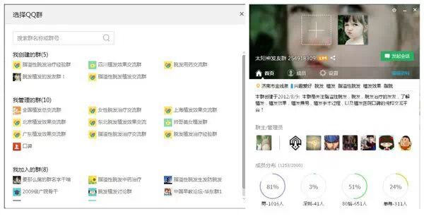 本人是一名医疗从业者,目前在一家治疗脱发的公司担任总经理助理一职,同时兼任社区化营销、销售等方面工作。由于工作原因,在我做自己的社区平台前,我积累了大量的有治疗需求的“粉丝”,QQ好友有1万3千人左右,且在持续增加。相关的500人以上QQ群有13个,这些用户量,都是通过天涯等论坛,百度知道等问答平台,以及做视频排名等引流慢慢集聚起来的。且QQ好友,跟QQ群好友,重叠性很小,换句话说,我有2万以上的潜在社区用户积累。