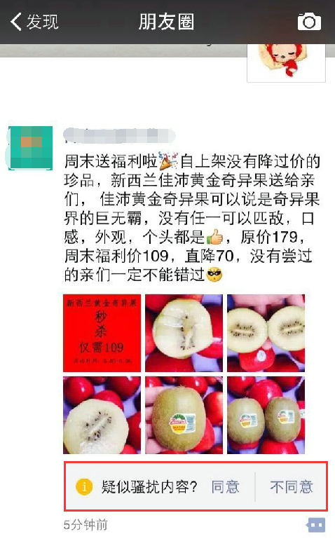 第一,针对朋友圈内容。被多人“同意”为骚扰信息的朋友圈内容会成为分析样本,提取出关键字,作为以后是否出现骚扰提示的判断依据。例如,一个微商发布的信息中包含“面膜”、“低价”等字眼,在这条信息被多人同意为骚扰之后,以后其他人发布的朋友圈内容中如果包含这些字眼,就有更大几率被系统实行骚扰判断。