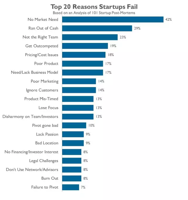 解决有趣的问题而不是满足市场需求的问题是创业失败的最大原因,占比高达 42%。正如 Patient Communicator 所写的那样,“我意识到,我们之所以没有客户,是因为没人对我们推介的模式真正感兴趣。医生想要的是更多的病人,而不是更有效率的办公室。”