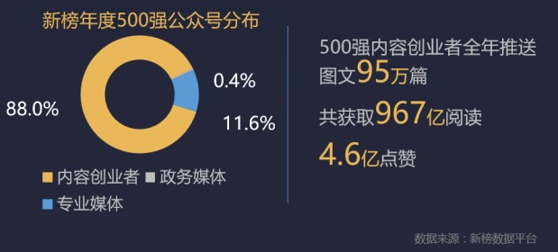 在新榜发布的年度中国微信500强报告中,数据显示内容创业者已成霸屏趋势。500强中有88%的公众号属于创业者,远超政务机构和专业媒体。2015年全年推送图文95万篇,共获取967亿阅读,4.6亿点赞。