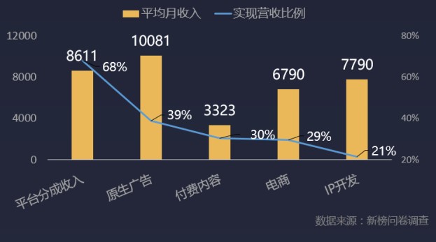 其次为原生广告。但以收入来看,广告收入为最高。通过付费内容、电商实现营收的比例相当,但付费的收入远远小于电商。值得注意的是,通过IP开发实现营收的比例虽低,但是平均收入却不少,甚至高于电商。