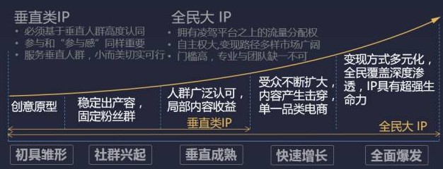 IP开发本身是一个高风险、高收益的细分领域。如图所示,热门大IP的成熟是一个千军万马走独木桥的过程,开发周期长、概率低。但是人群的圈层化与内容消费的垂直化为垂直小IP的诞生带来了新的机会。这是由于垂直人群通过社交网络高效聚集,圈层内的持续激荡与粉丝的高度热爱足以支撑社群通过内容+电商等创新方式实现变现,不用等待最终全面大IP形成后再借助票房、衍生品、版权等手段实现投入变现。