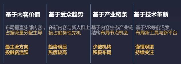 内容生产的产业链上各个环节与不同维度都得到资本方充分的价值肯定。各资本方聚焦的投资方向包括以下四类: