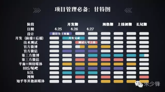 这张图就是一张完整的甘特图,你在做任何活动之前,或新产品上线之前,去做一张这样的图,你的同事、领导就能清楚的知道你到底要做什么。