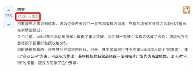同时获得授权的,还有其他三家国内同行。但是,其中某家同行并不希望bilibili加入这个“朋友圈”,遂以“商业公平”为由,向版权方提出:获得授权的各家必须统一使用贴片广告作为商业模式。出于对“和谐”的考量,版权方同意了这个要求。