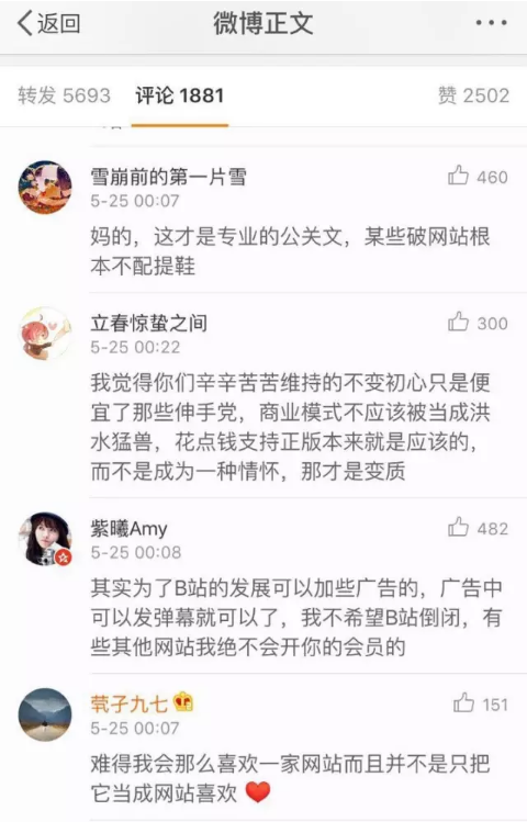 7、 表决心。这一点很关键,不仅用户在明白来龙去脉之后不会埋怨B站,甚至像我这样的人都会对B站和陈睿路人转粉。陈睿说,下次再遇到这样的情况,B站一定会尊重用户的意见,宁可不上番剧,暂且不论是否能做得到,但有勇气说出这句话,还是要敬他是条汉子!最后那句“b站未来有可能会倒闭,但绝不会变质”更是热血满满,都是热泪盈眶了好嘛?