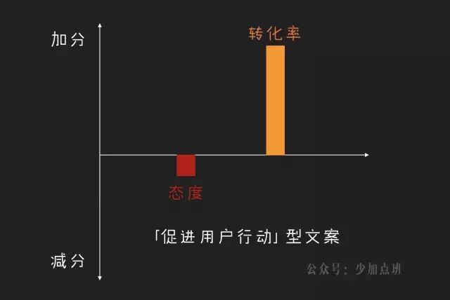 反过来,侧重于转化率的文案通常能短时间带来直接效益,但(在用户刚接触到文案的时刻)却是以牺牲“用户态度”为前提的。
