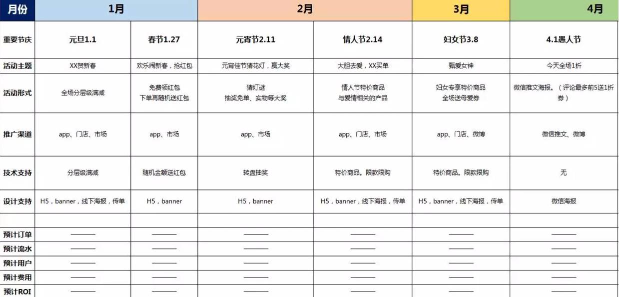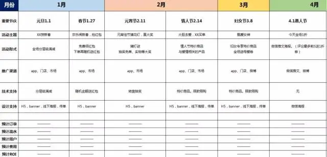 我的建议是每一个季度提前做好活动日历表,针对每个重要的节日节点,都列出来。先进行大体的规划。这样做有3个很重要的原因: