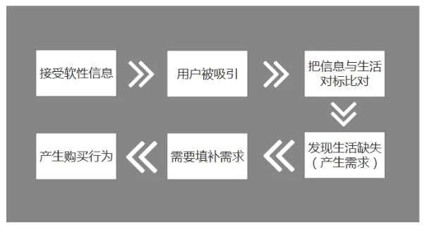 这里我们可以看到,用户是先接受的信息,也就是商家给他营造的购买场景,在这个场景下,用户是被动接受信息,商品的植入也是隐性的,用户对标的是现有的生活环境和自己需求(可能是隐性需求),是被动接受信息的状态。就如同咪蒙的软文,先吸引你的注意,然后告诉你一个事实,你需要这个产品,你的生活才能被改变,生活品质才能被提升,这样的商品信息容易被大众接受。润物细无声,就是这种心理变化曲线。