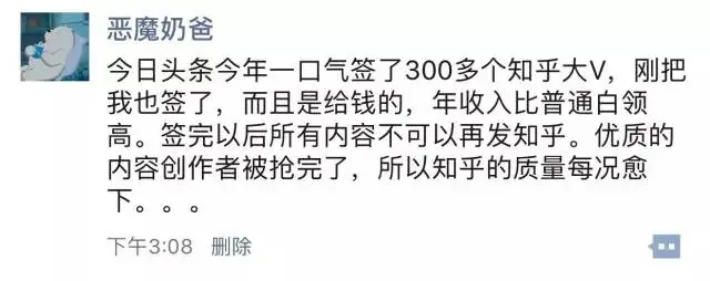 最近两天圈内就头条砸重金签约知乎300位大V事件闹的沸沸扬扬,知乎官方发申明表态继续努力让内容创作者过得更好,事件当事人[恶魔奶爸]也在昨天跳出来吐槽知乎了,整个事件还在发酵。
