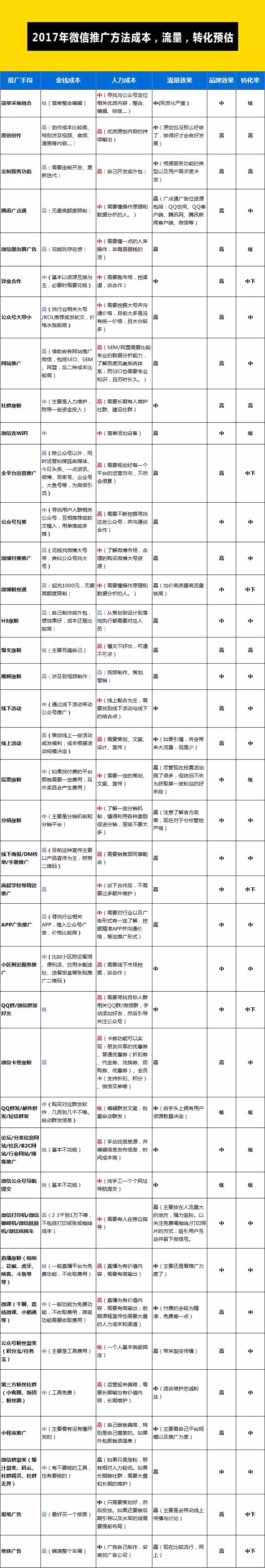 这些推广方法绝大多数基本都是我操作过或接触过的各种微信推广方法。所以对其成本,流量效果,品牌效果,用户转化率效果都有个大概的预估。
