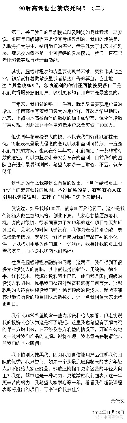 在面对牛逼吹得略大,被懂行人毫不留情的拆穿之后,有着男版马佳佳称号的“超级课程表”CEO余佳文终于在昨夜通过微博发文反击了。