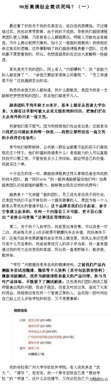 其实在余佳文这品微博出来的前后不到12小时内,超级课程表的天使投资人,广州创新谷孵化加速器创始合伙人,前华为互联网业务总裁朱波也发表了一篇公关稿,名为《换一双眼睛看佳文》。
