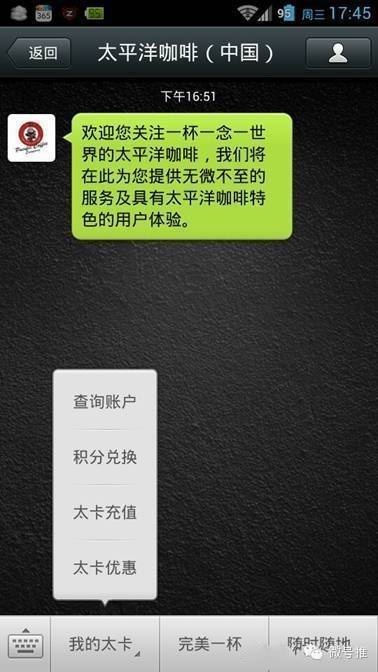 太平洋咖啡还提供了另外两种支付模式——会员卡消费和积分兑换。利用微信提供的Open ID接口,太平洋咖啡完成了自身会员体系与微信用户体系的融合,建立起数字化连接,实现了会员卡的绑定、查询、充值、积分兑换,甚至传统电子优惠券的使用,从而可以触达用户实现二次连接。